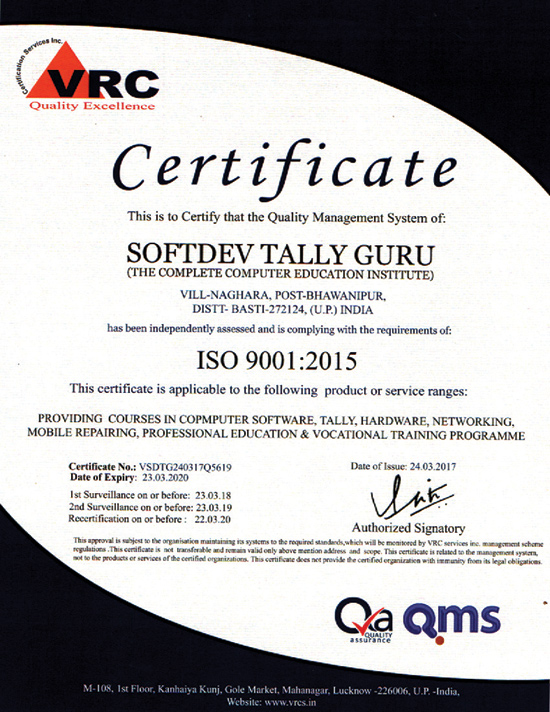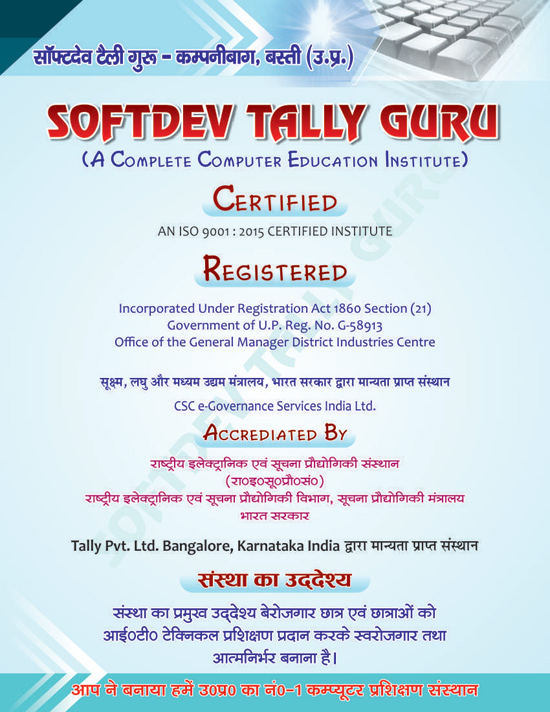 SoftDEVtallyguru Computer Education Center is An ISO 9001-2015 Certificate and U.P. Govt. Registered Institute in Basti. We are providing latest and quality concept based computer education at resonable rates for the last 10+ years by qualified and experienced faculties.We are running by professionals, for Professionals.